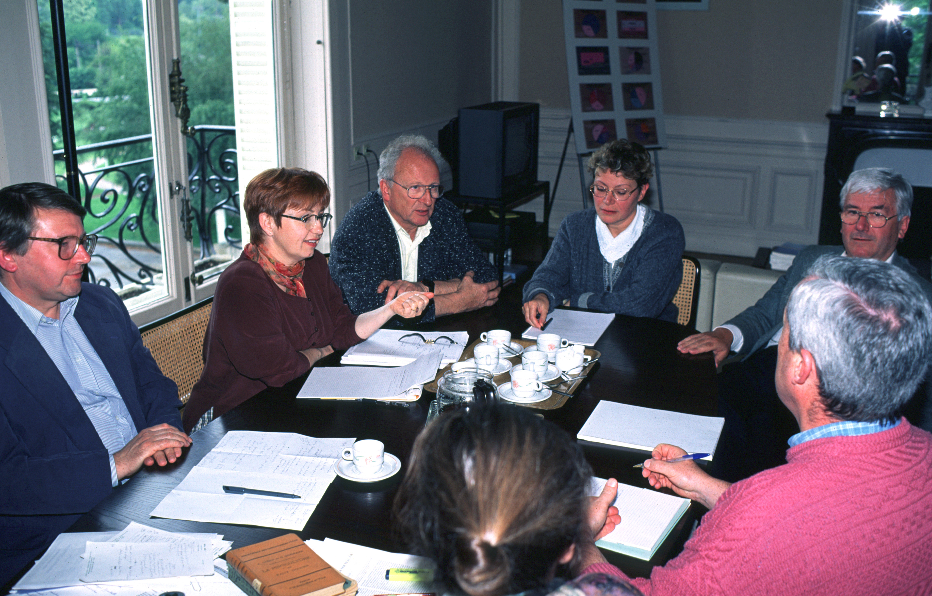 Groupe de personnes en réunion. Pierre-Henri DUEE, Anne-Marie LAVIALLE, Bernard MORET, Robert DUCLUZEAU de face à droite, Jean-Pierre DELAGE de dos à droite. Jouy-en-Josas, décembre 1996